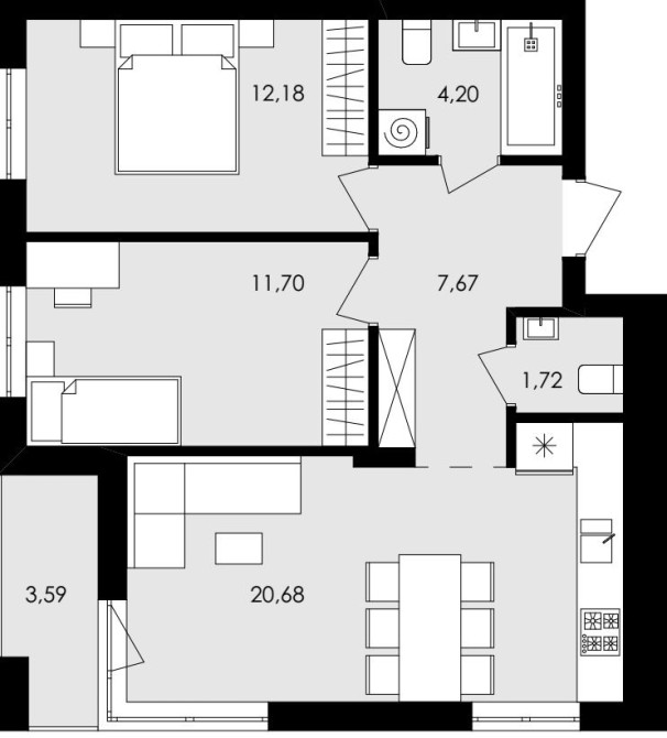 Велика кухня-вітальня з лоджією, дві спальні, гардероб та ванна кімната.