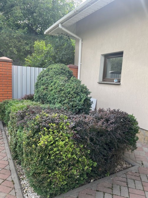 На ділянці ростуть фруктові дерева, висаджені квіти та хвойні рослини по ландшафтному проекту, встановлений полив та постелений газон.