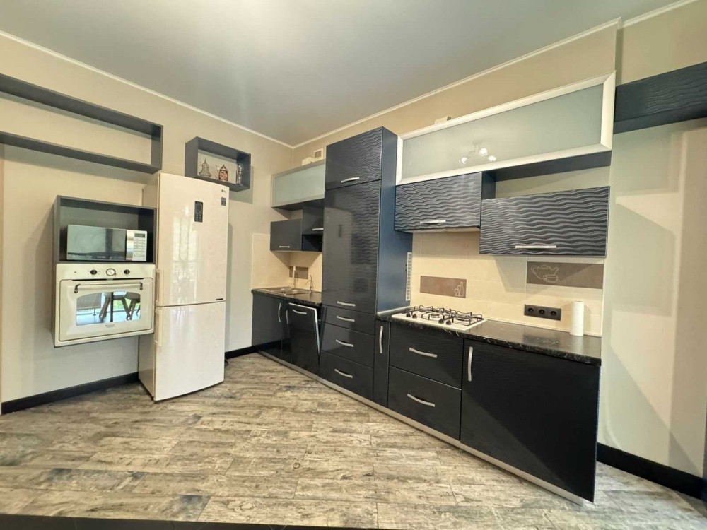 - Велика кухня- вітальня, мебльована та укомплектована побутовою технікою. Поділена на 2 зони: робоча та зона відпочинку з диваном.