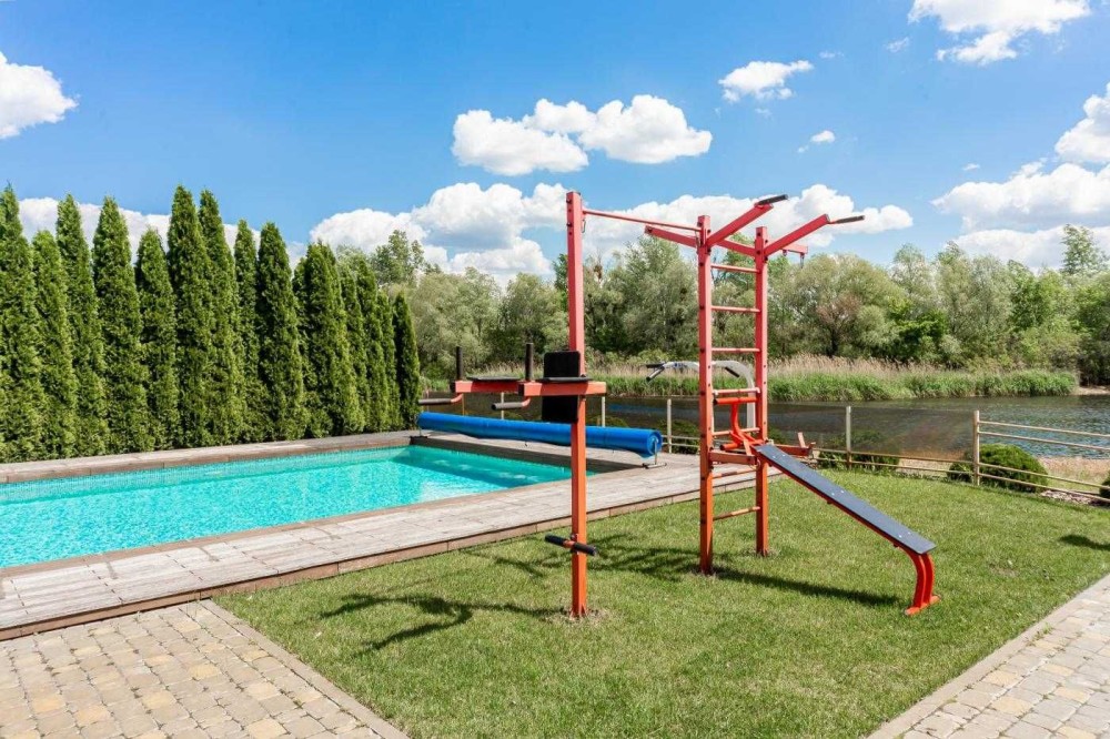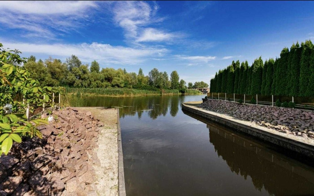 Велика берегова зона. Зроблено дубове берегоукріплення, освітлення по всій території та власний гараж для яхти і гідроциклу.