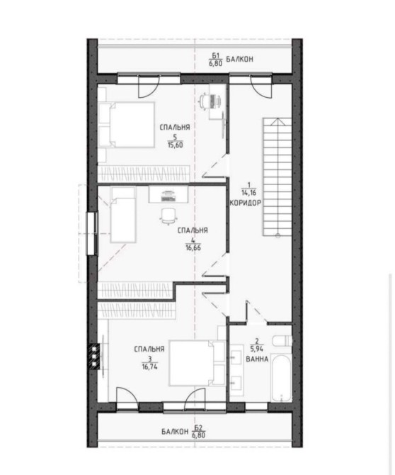 2 поверх: три спальні, санвузол, балкон.