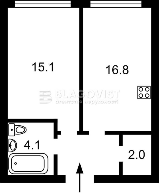 Площа: Загальна - 43,0 м² / Житлова - 15,1 м² / Кухня - 16,8 м².