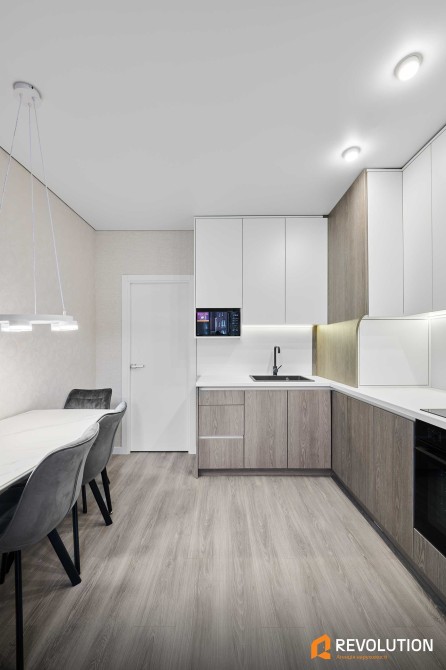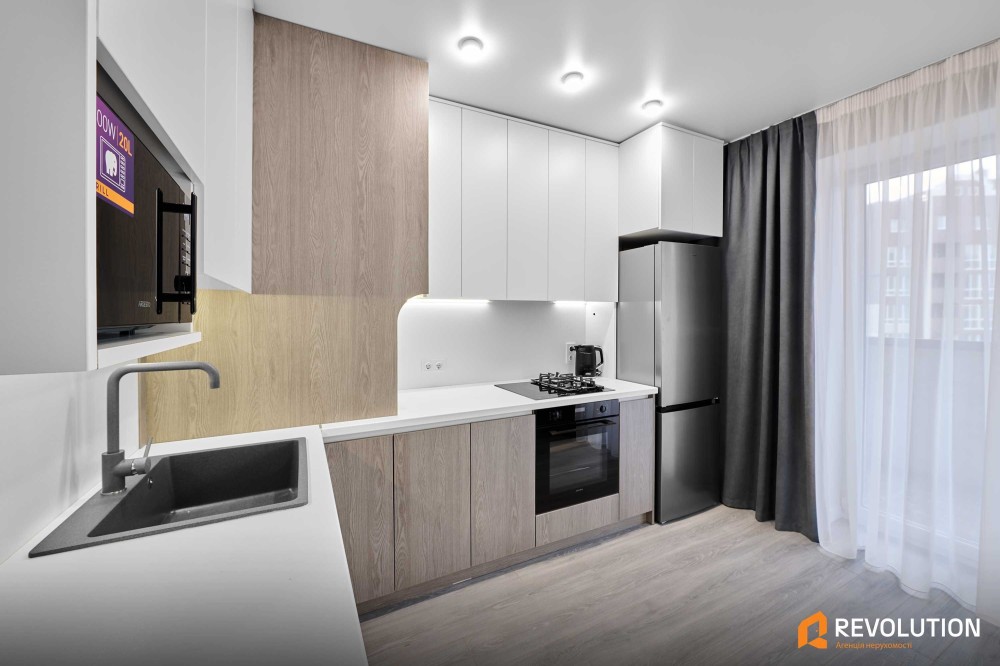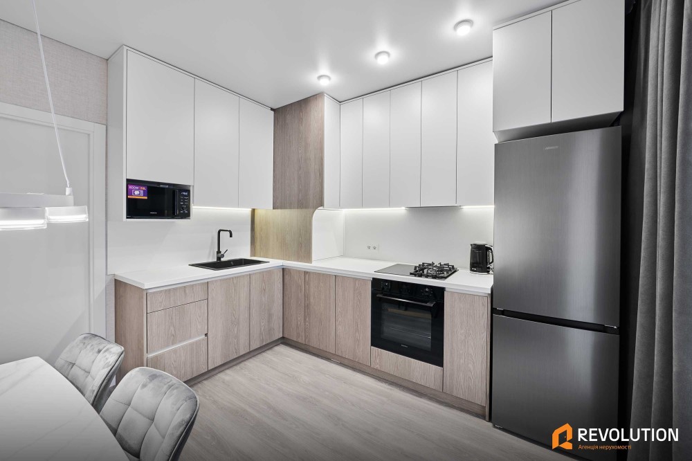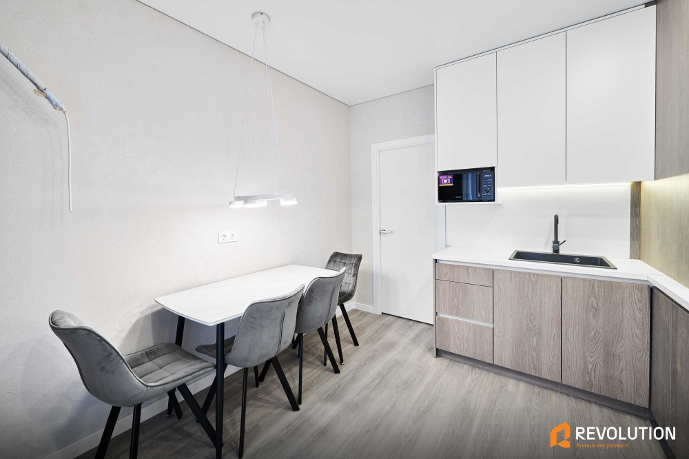 Кухня: газова та індукційна варильна поверхня, духова шафа, холодильник, морозильна камера, витяжка, мікрохвильова піч, двоконтурний газовий котел, є вивід під кондиціонер, обідня зона з 4 стільцями.