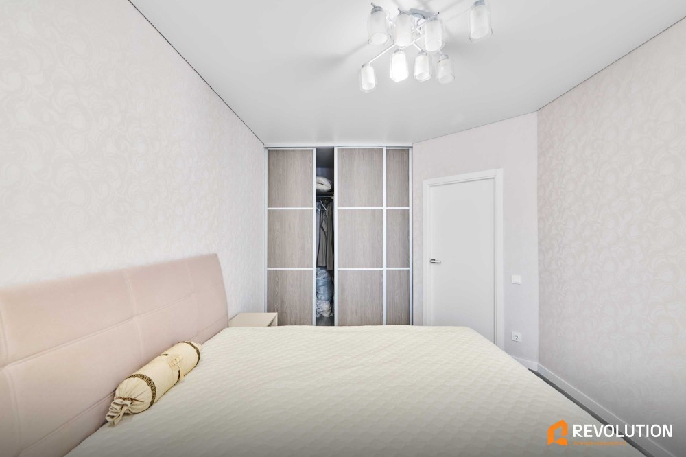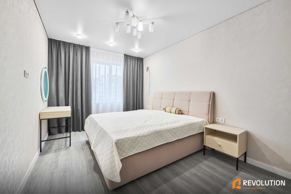 Спальня: двоспальне ліжко з ортопедичним матрасом, комоди, дзеркало з підсвіткою, є гардероб.