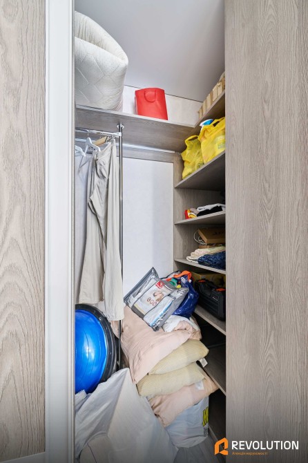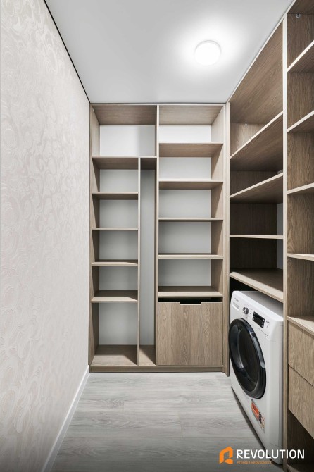 Технічна кімната/гардероб обладнана пральною машиною та багатьма нішами для зберігання речей.
