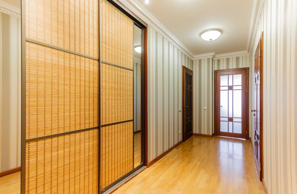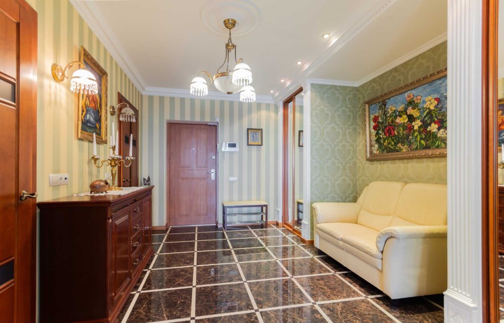 Стіни по усій квартирі оброблені дорогими шпалерами в стриманій молочній гаммі.