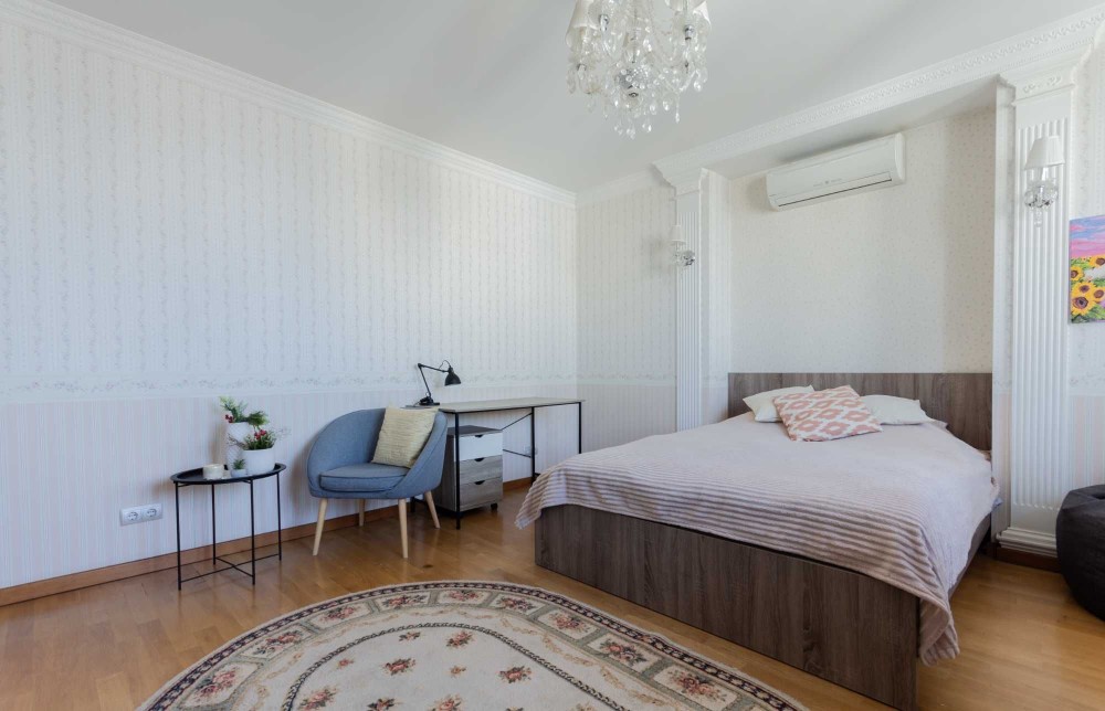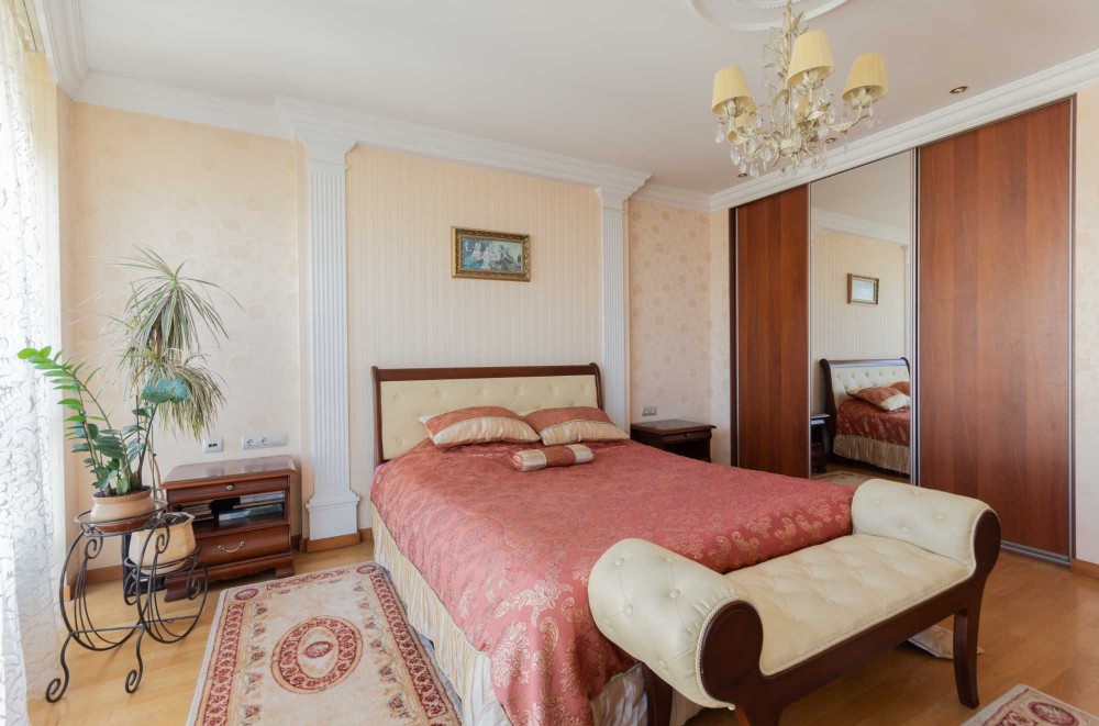 Спальня оформлена в ідентичному стилі, обставлена якісними меблями : розкішне ліжко, комод, приліжкові тумби, туалетний столик, вмістка шафа для зручності розміщення Ваших особистих речей.