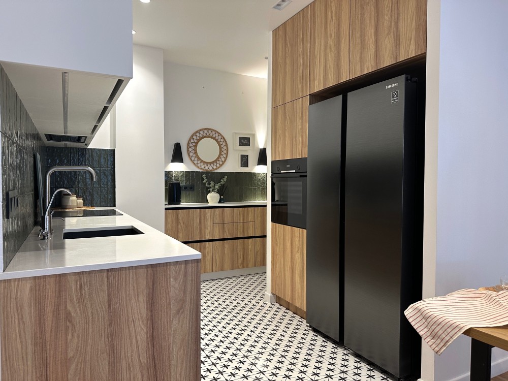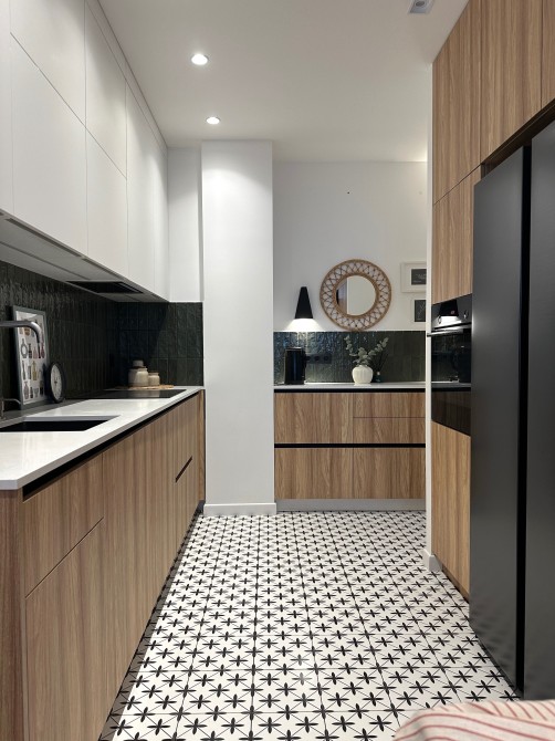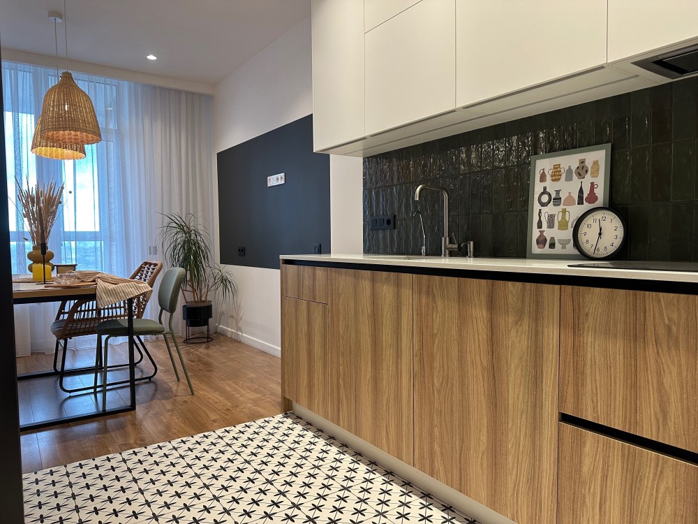 - мінімальне перепланування: кухня збільшена за рахунок додаткових шаф, є зручна каво-чайна зона;
