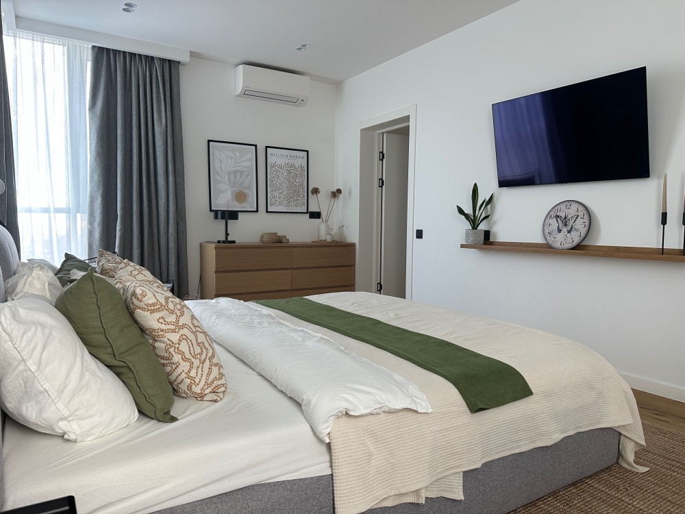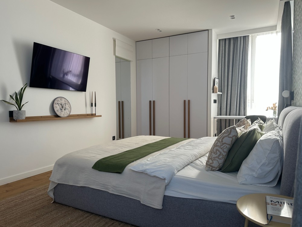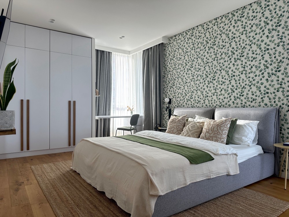 - у майстер-спальні — зона відпочинку, робоче місце, містка система зберігання та панорамні алюмінієві склопакети, що додають простору й світла.