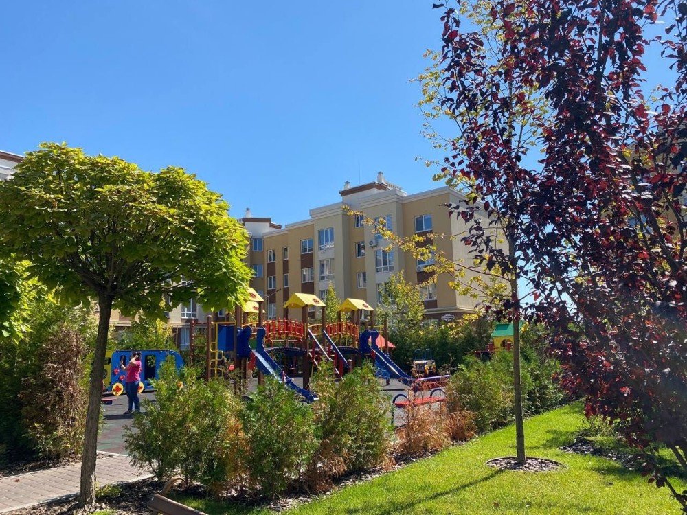 У дворі дитячий майданчик, сучасне укриття, безліч секцій для діточок.