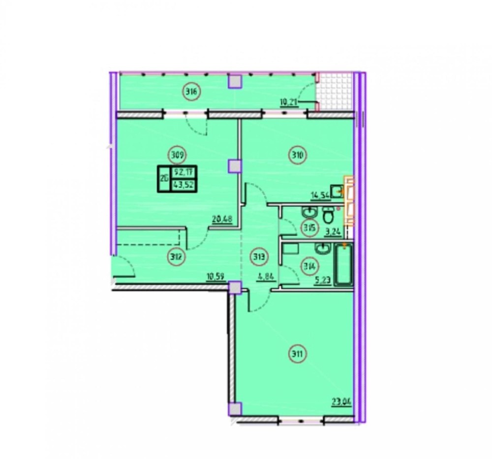 Формат квартири: двухстороння, загальною площею 93 кв.м, кухня-вітальня 14,5 кв. м, дві ізольовані кімнати - 20,5 кв.м та 23 кв.м, два санвузли, лоджия 10 кв.м, передпокій 10 кв.м.
