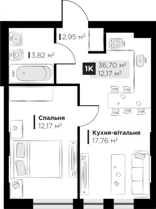 Загальна площа — 36.7 м², житлова — 12.17 м², кухня — 17.76 м².