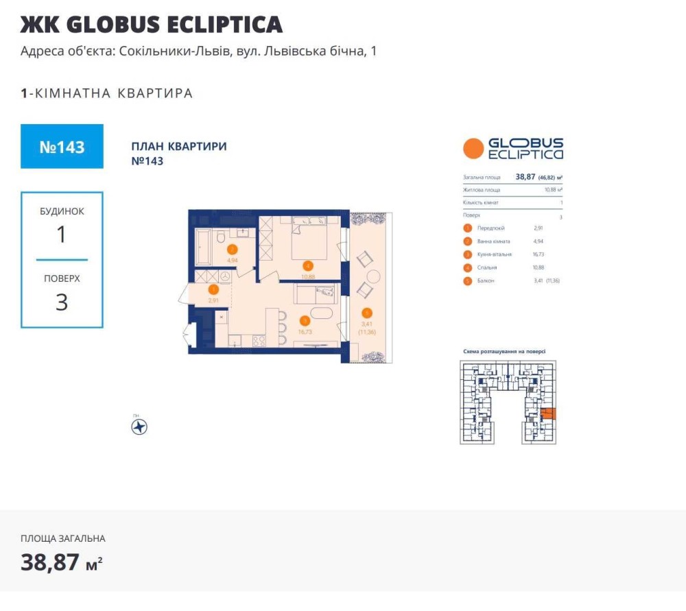 Продаж 1кім. кв.38.87м,ЖК Глобус Ecliptica