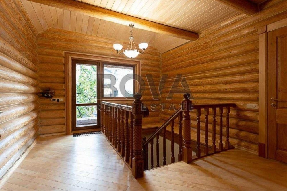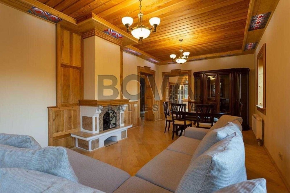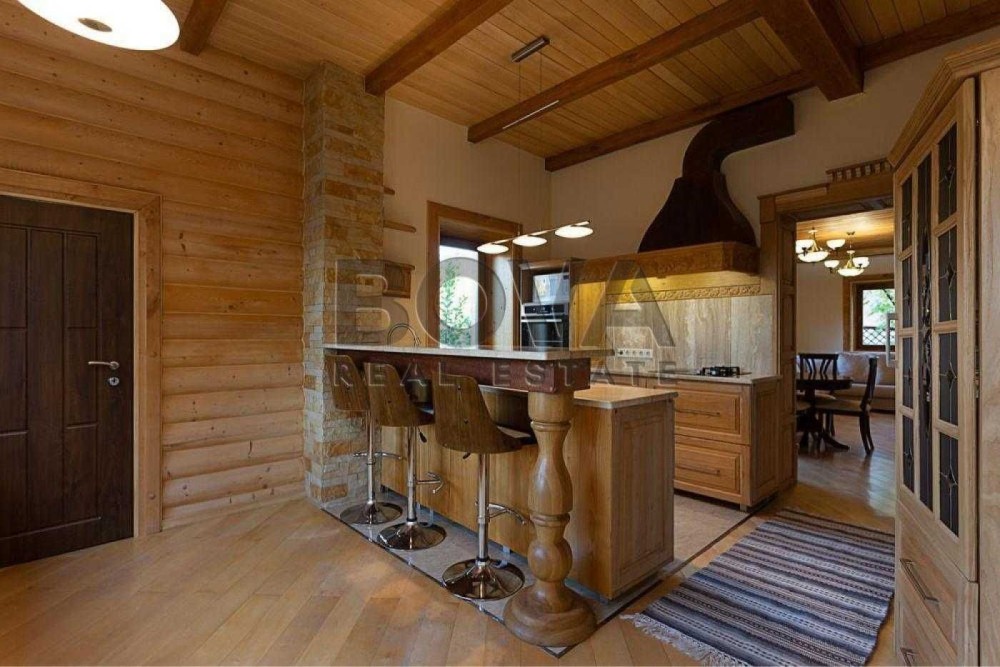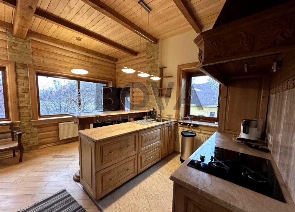 На першому поверсі — простора вітальня-їдальня з дров’яним каміном, кухня з повним комплектом сучасної техніки (газова та електрична варильні поверхні), окремий кабінет, хол та санвузол.