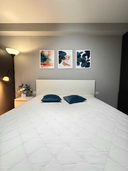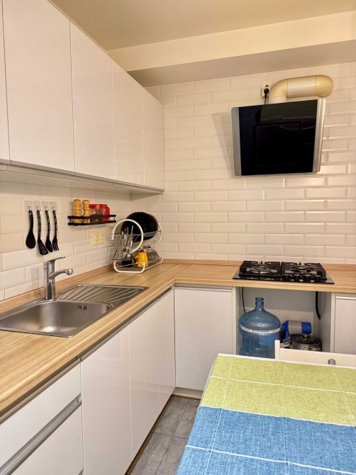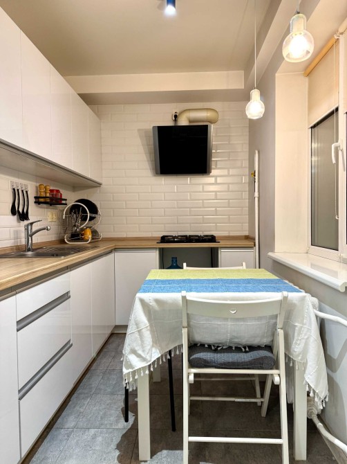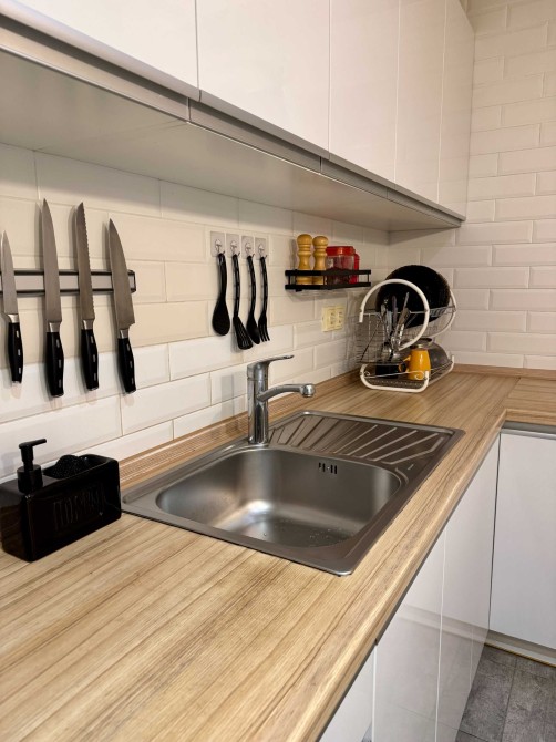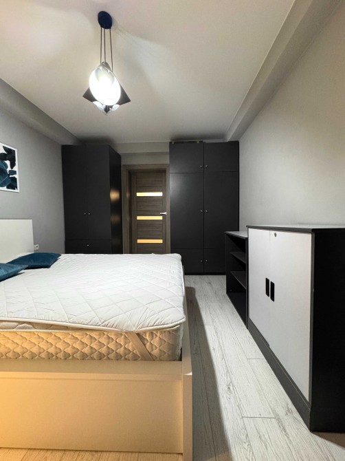 В спальні двоспальне ліжко з якісним ортопедичним матрацом та велика шафа для зберігання речей. В кухні-вітальні зручний розкладний диван та обладнані комфортні робочі місця.