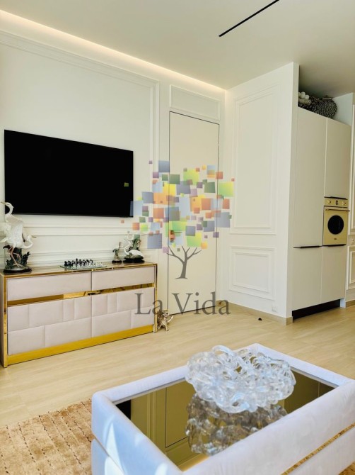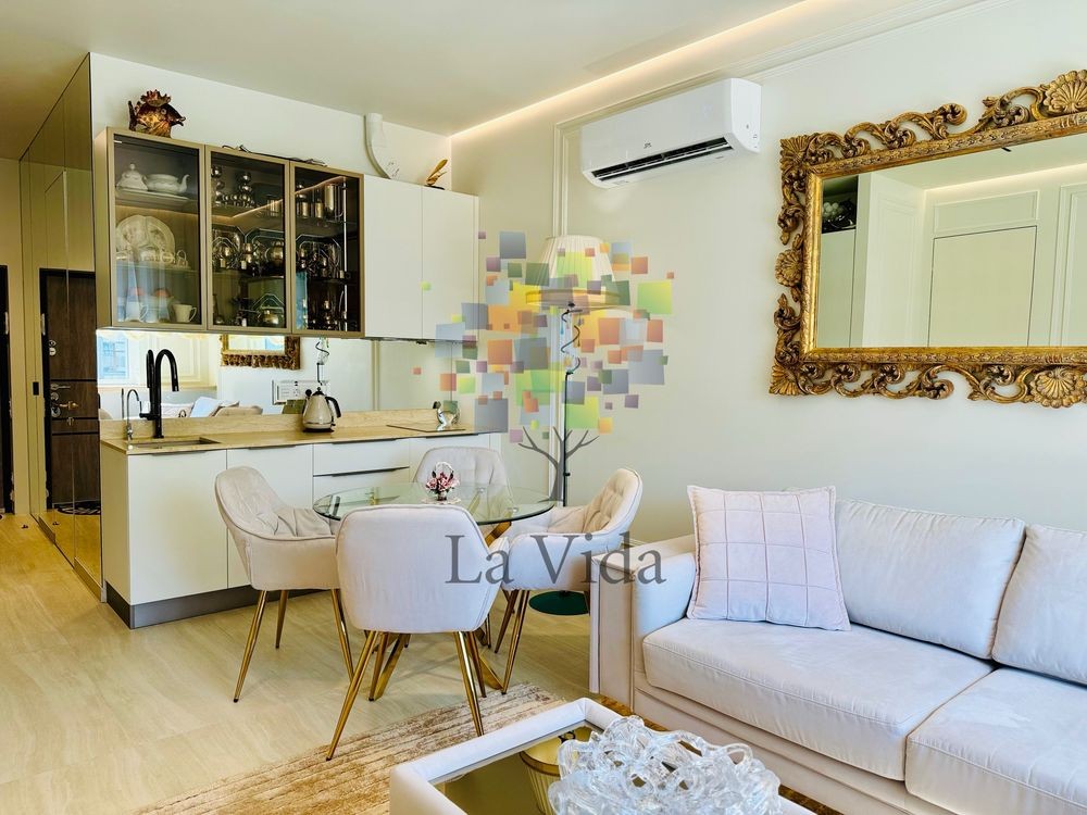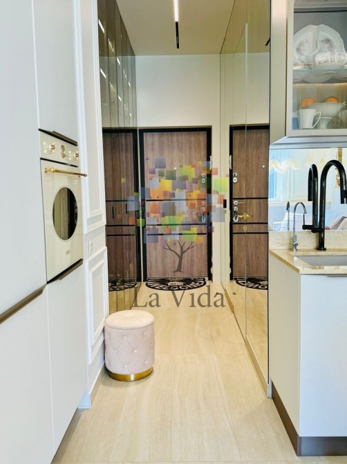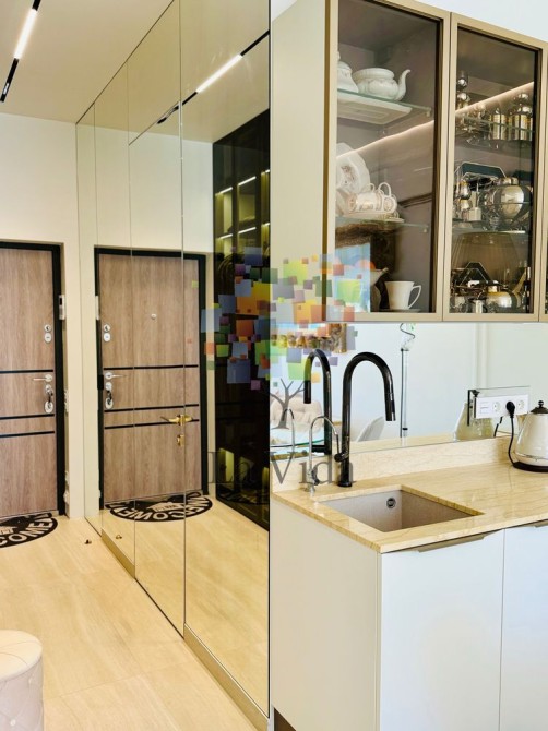Кухня-студія укомплектована меблями та технікою, виготовленими на замовлення від провідних виробників, що забезпечує чудове поєднання смаку і якості. Це ідеальне рішення для тих, хто прагне жити в сучасному та комфортному просторі.