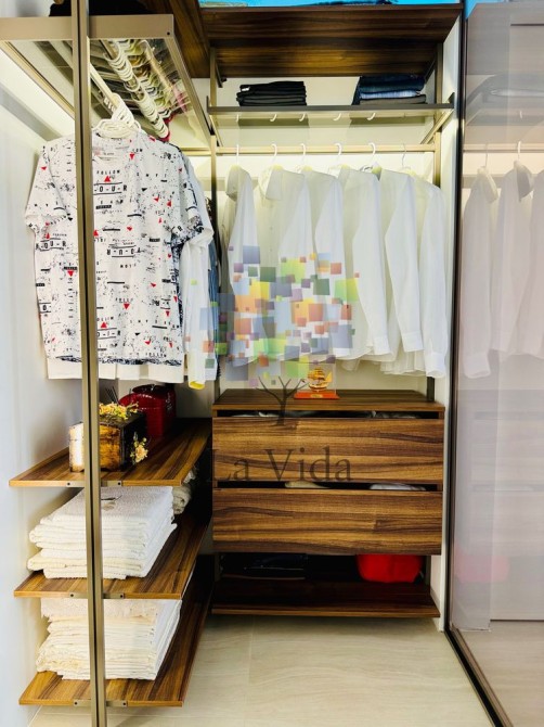 Спальня також виконана в світлих тонах, під загальний дизайн квартири. Усі лінії в інтер’єрі витримані під кутом 90 градусів, що додає приміщенню чіткість і стиль. Використані лише якісні та натуральні матеріали, такі як льон і шовк, що створюють відчуття затишку та елегантності. У кімнаті розташована велика гардеробна, відокремлена скляною перегородкою.