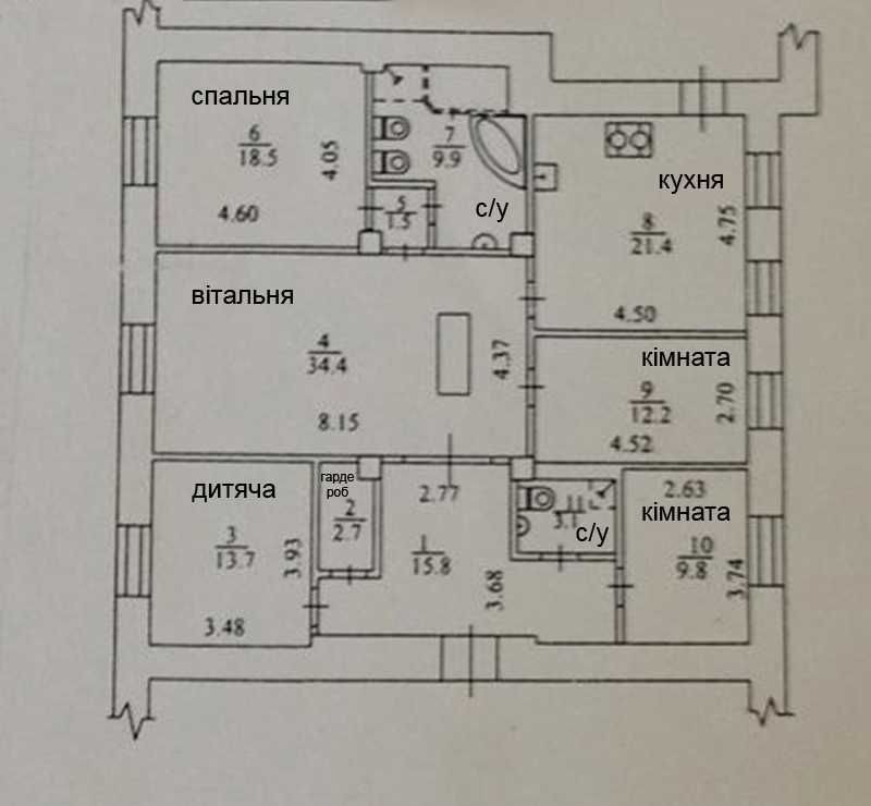 В квартирі п’ять кімнат. Квартира продається з меблями та технікою. Господарська спальня площею 18,5м2 зі своє ванною кімнатою 9,9м2, вітальня пл.34,4м2, кухня 21,4м2, дитяча кімната 13,7м2, дві кімнати вільного призначення, можливо використовувати як кабінет або дитячу(12,2м2 та 9,8м2), вбиральня з душовою 3.1м2. В квартирі велика кількість вбудованих шаф, також є гардеробна. Кухня укомплектована: посудомийною машиною, холодильником, плитою, духовкою, мікрохвильовою. Також в квартирі є: Smart TV в вітальні та в дитячій, охоронна сигналізація, фільтри для води, кондиціонери, пральна машина, бойлер, газовий котел, швидкісний інтернет, відео домофон. Висота стелі 3.2м. Підігрів підлоги в с/у та на кухні. Встановленні лічильника на воду та електроенергію.