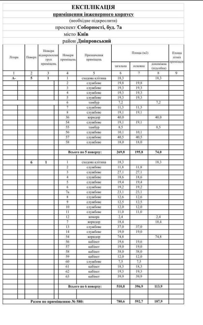 Вартість приміщень на 6-му поверсі (510м2) - 175 000USD - 343USD за м2