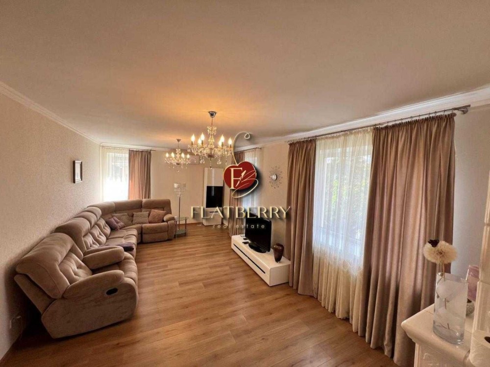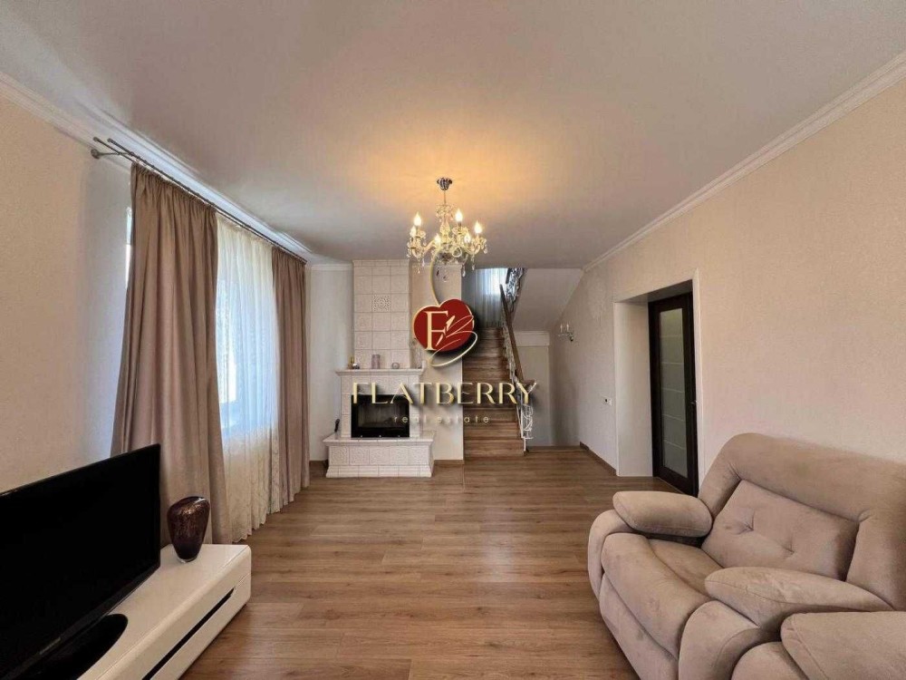 Великий будинок має 2 входи, на першому поверсі знаходиться: великий зал з каміном і розкладним диваном, кухня з усією необхідною технікою (є посудомийка), на полуторному поверсі знаходиться дитяча з балконом, кабінет, на другому поверсі - 2 спальні, в будинку 2 с/в. На 1 етапі є душова кабіна, в на 2 поверсі - велика ванна. Встановлена система очистки води Осмос.