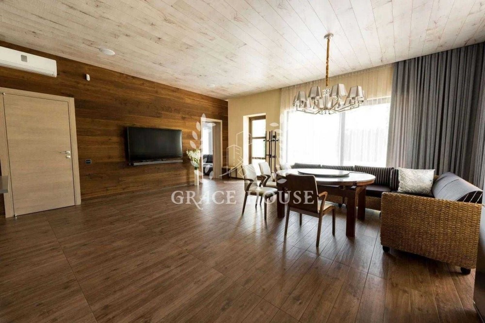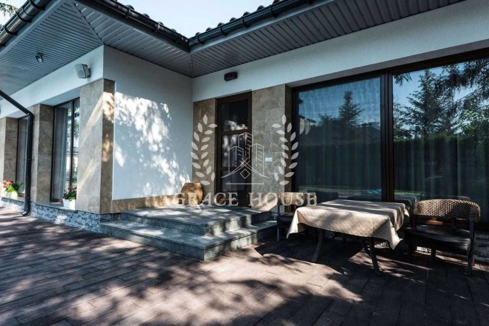 Основной дом 300 м² — воплощение архитектурной утончённости: панорамные окна, дизайнерский ремонт, изысканная мебель — всё готово для жизни без компромиссов. Три спальни в каждой свой с/у кабинет гостиная кухня-столовая, выход на террасу. Мебель, сантехника, шторы ведущих мировых производителей. Дом делался для себя с вниманием к деталям и со вкусом.