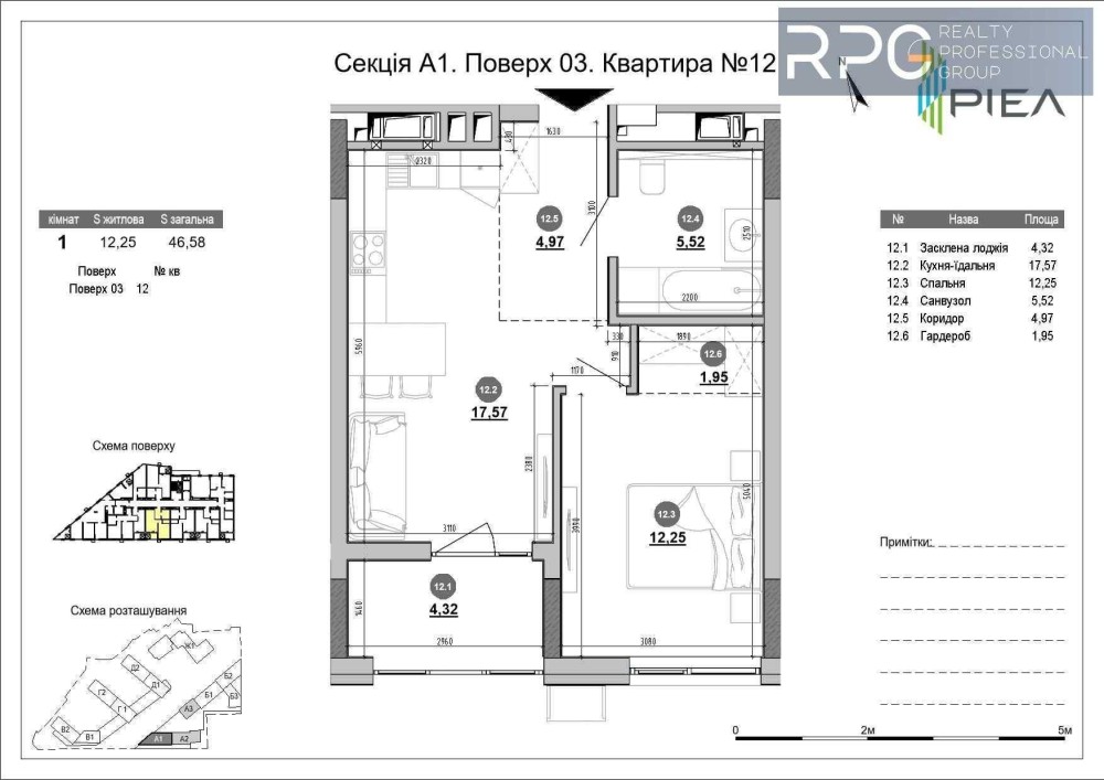 Загальна площа - 46.58 м², житлова площа - 12.25 м², простора кухня-вітальня - 17.57 м².