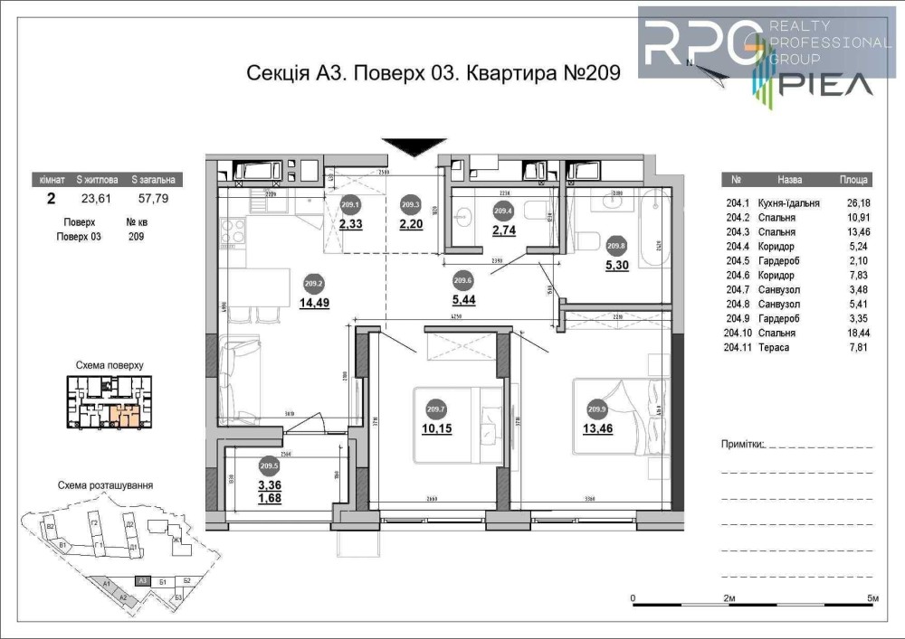 Загальна площа - 57.79 м², житлова площа - 23.61 м², простора кухня-вітальня - 14.49 м².