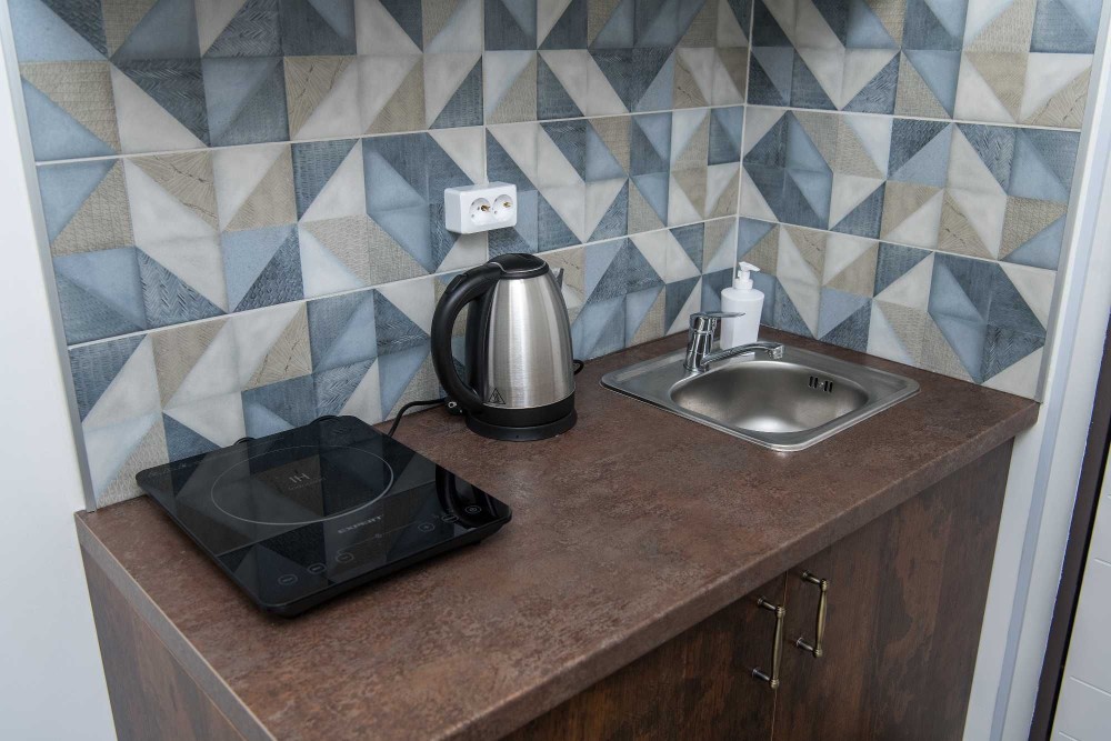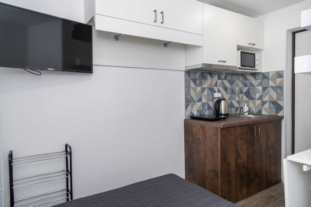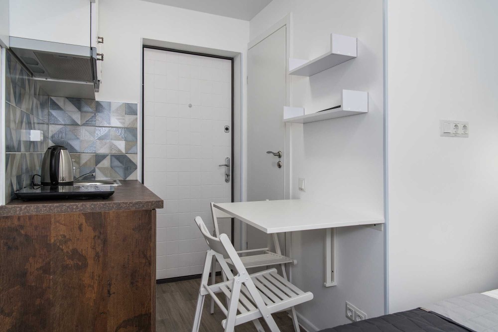 • Каждый смарт имеет свой санузел, кухонную зону, зону отдыха и полностью укомплектован мебелью и современной бытовой техникой.