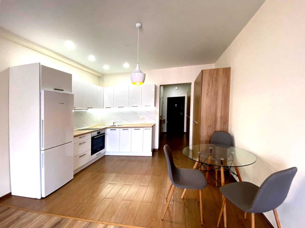 Квартира з ремонтом, обладнано меблями та технікою, планування - студіо. Є окрема гардеробна! Лічильники на воду, електроенергію та тепло (автономна котельня). Сучасне фойє, два ліфти, один ліфт спускається в підземний паркінг, також є сходи в паркінг.