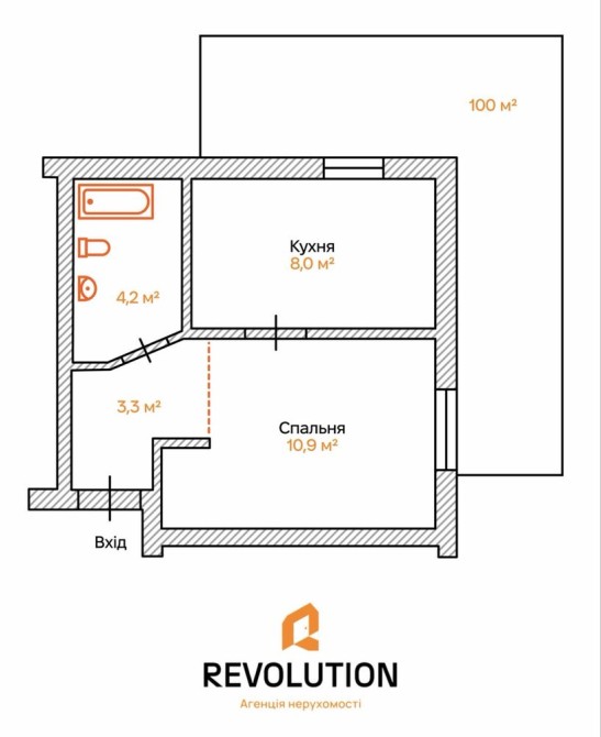 • Площа: загальна 26.4 м², житлова 10.9 м²