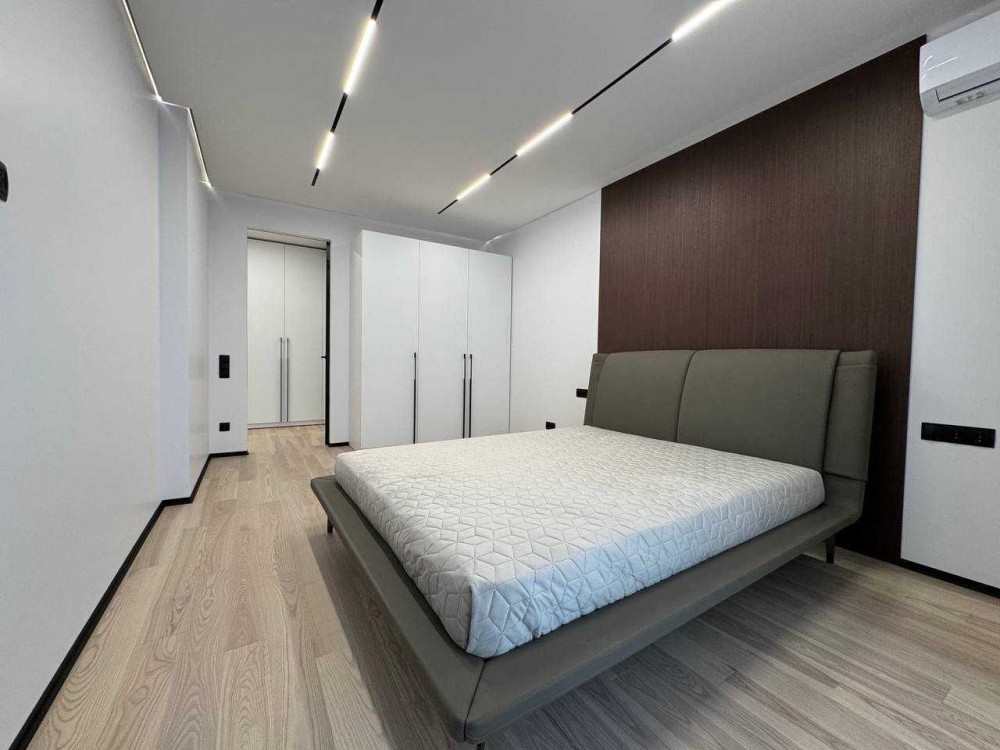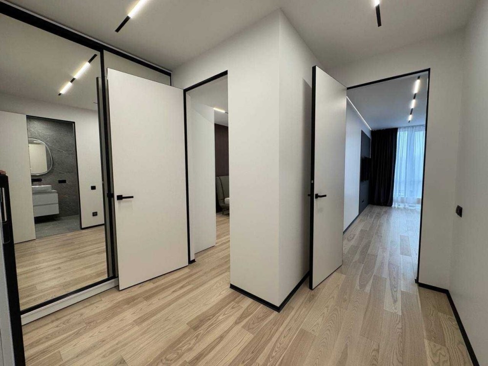 Двері прихованого монтажу 2,3 м, паркетна дошка ясень білий, стеля гіпсокартон з тіньовим швом та трековим освітленням, стінова панель шпон горіх,плитка керамограніт, підігрів підлоги сан вузол, балкон,якісні вбудовані шафи мдф, кухня мдф софт тач,