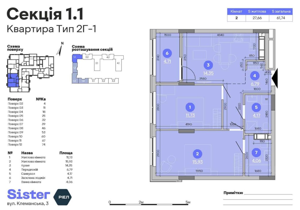 Пропонуємо вам 2-к квартиру площею 62 м² у ЖК Sister, за адресою: вул. Клеманська, 3 — Дарницький район, м. Київ.