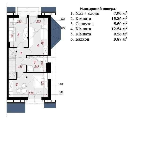Планування: кухня-вітальня з місцем під камін, кабінет, 3 спальні, 2 с/в, горище, місце під терасу/BBQ, паркомісце, навіс/гараж — опції.