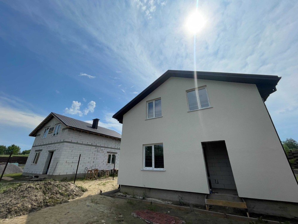 Автоматичні ворота. Вʼїзна група буде вимощена тротуарною плиткою. Фасади зроблять як тільки для цього будуть сприятливі погодні умови. Також бонусом будуть зелені насадження біля будинку.