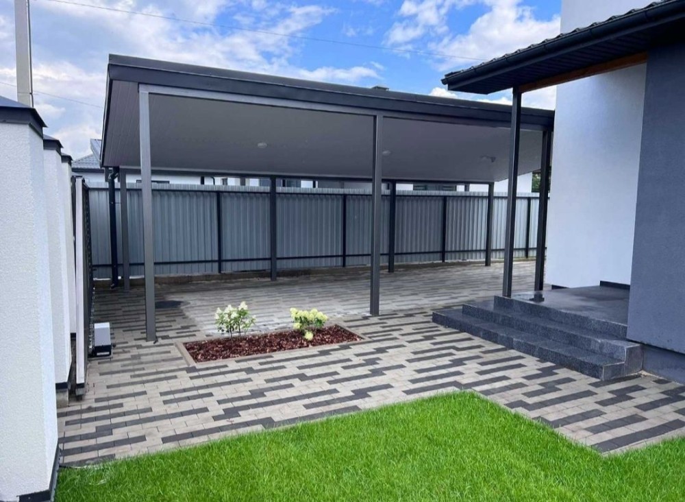 Під навісом може розташуватися кілька автомобілів. Вимощені тротуарною плиткою доріжки, відмостки, майданчик для авто під навісом.