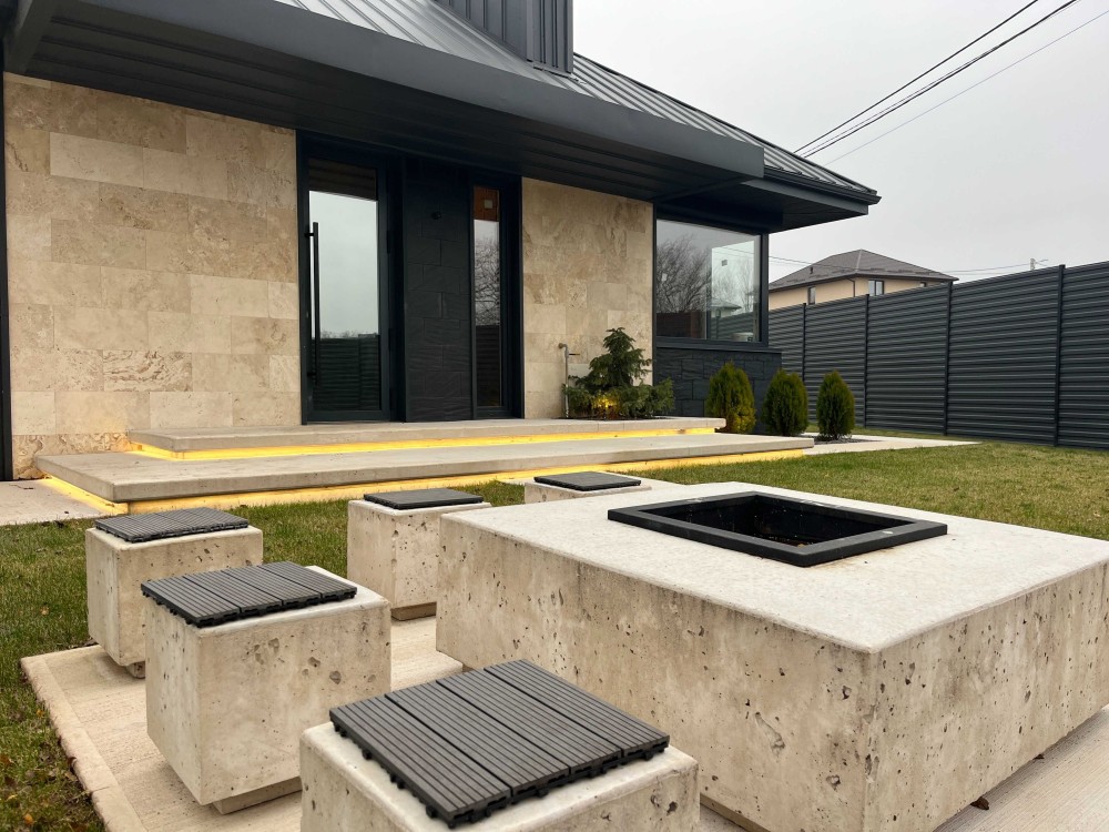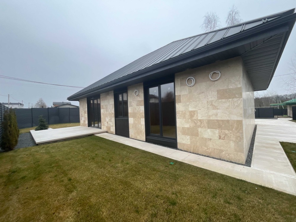 • Фасад: мармур + сланець