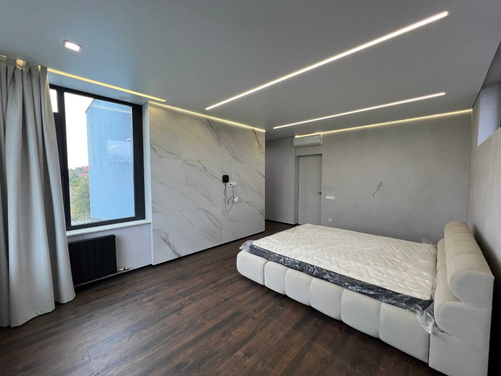 Простора кухня-вітальня, три спальні, гардеробна, три санвузли, дві тераси та власний гараж із зарядною станцією для електромобіля.