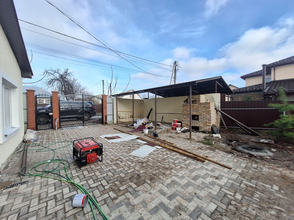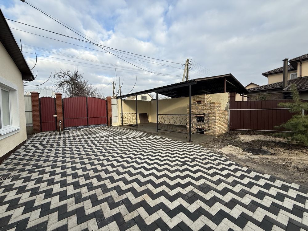 Ділянка 3,5 сотки , мощений тротуарною плиткою двір, зона барбекю з піччю та з альтанкою , погріб, паркан по периметру, ковані ворота та хвіртка. Парковка у дворі розрахована на 3 авто