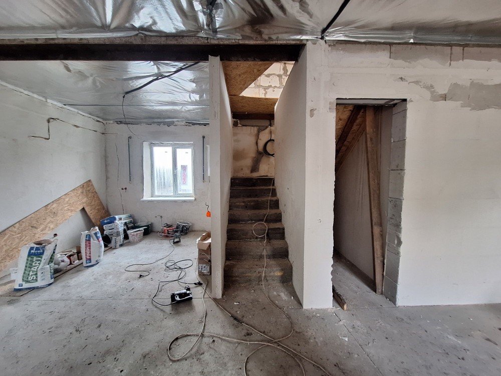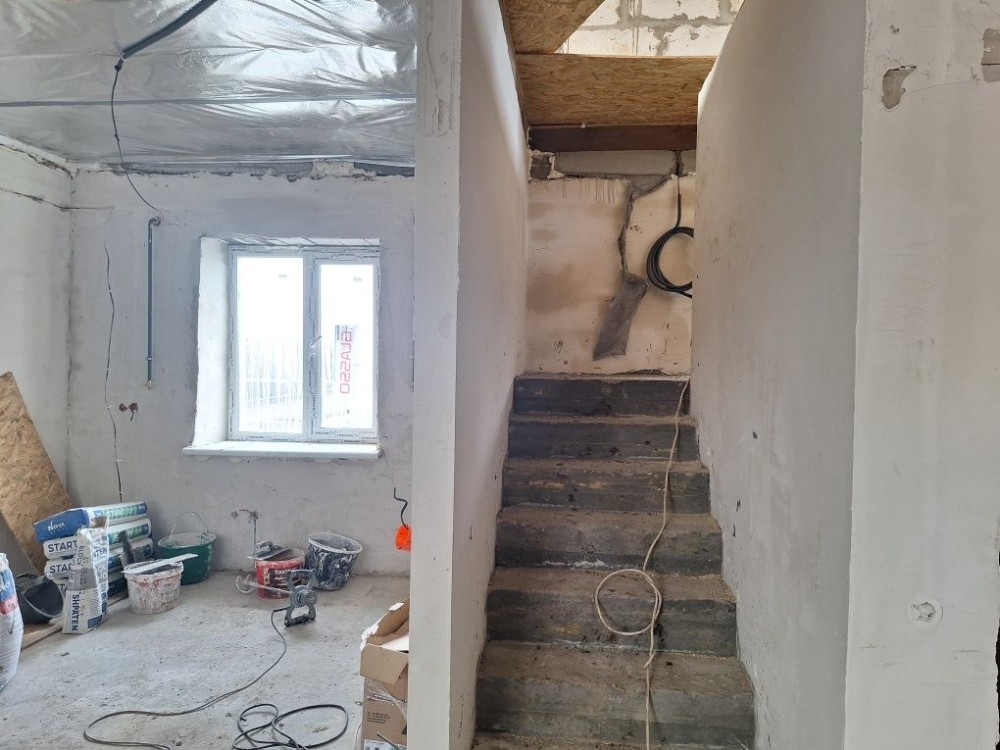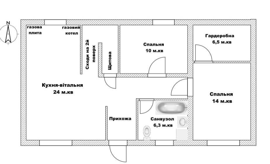 Перший поверх- передпокій, кухня- студія , санвузол, топкова, 2 спальні кімнати , одна з яких з гардеробною. Лита бетонна сходинкова на мансардний поверх вільного планування, можна зробити там 2 кімнати, санвузол, хол, Є ВЕЛИКІ ВІКНА.