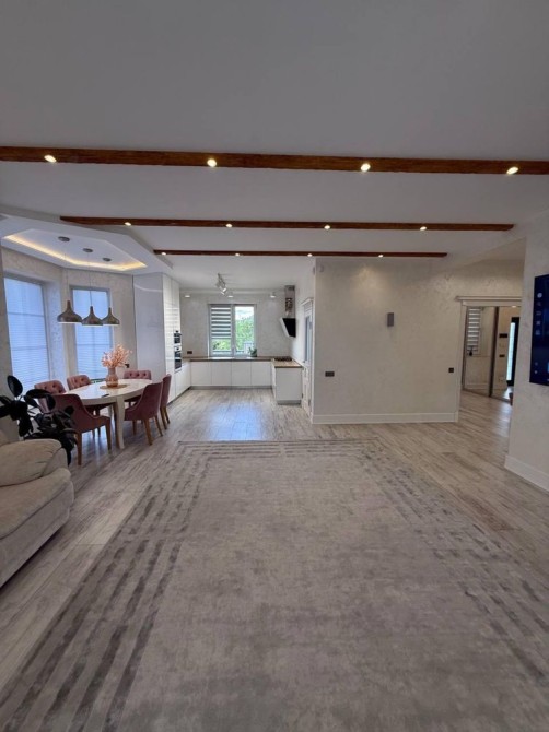 Будинок з якісним ремонтом, меблями, підігрівом підлоги по всій площі та утепленим дахом. Прихожа з великою шафою, три окремі кімнати: батьківська спальня 16 м² та дві дитячі по 14,5 м². Санвузол 7,5 м². Простора кухня-вітальня 35 м² з каміном, обідньою зоною, вмонтованою кухнею та всією побутовою технікою. Є тех.кімната на кухні (котельня,пральня).Вихід на заднє подвір’я та тераса з виглядом на зелений двір, обладнана автоматичним маркізом.