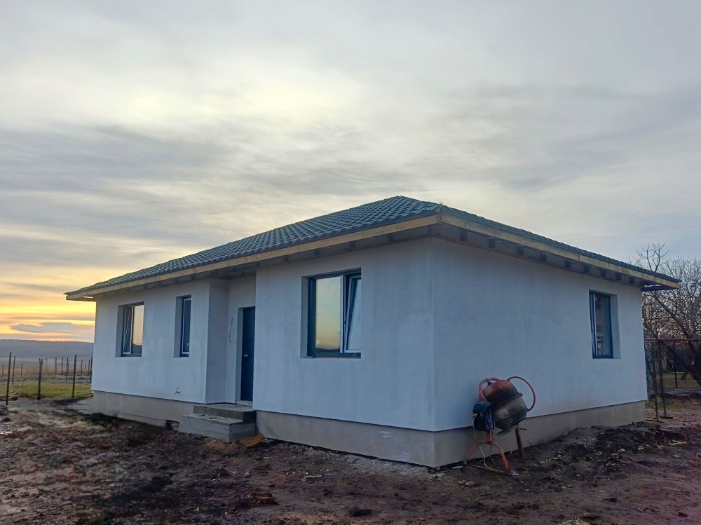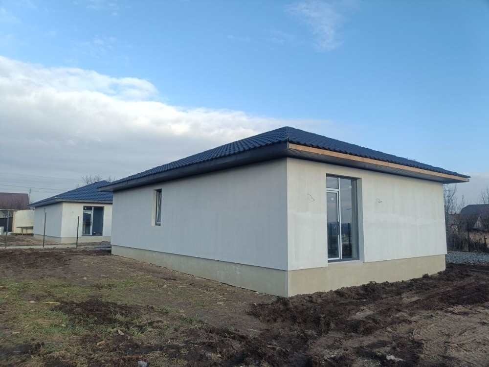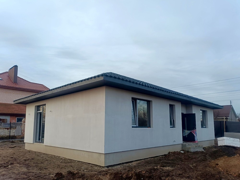 Будинок знаходиться на земельній ділянці в 10 соток. Земельна ділянка приватизована, має прямокутну форму 25 на 40 м, майже горизонтально рівна, різниця по діагоналі складає не більше 30 см по висоті. Будинок має монолітний армований ленточный фундамент. При армуванні фундаменту та стін використовувалась арматура 1,2 см. Стіни виконані з пеностирольних блоків де всередину вставлена арматура і залита бетоном. Перекриття між першим та другим поверхом та горищем виконано з дерев'яних балок 20 на 30см. Будинок покритий металочерепицею. стоять металопластикові вікна та технічні вхідні двері. На земельній ділянці знаходиться приватна водяна скважина та заведена вода в будинок. Будинок підключений до зовнішнього електропостачання з величиною прогнозованої приєднаної потужності 7 кВт напруга приєднання 380 B. Зовнішній розмір будинку по ширині складає 11,5 м, по довжині 13,4 м. Жила площа першого поверху складає 127,29 м². З них кухня складає 32,63 м², зала складає 36,47 м², кімната складає 23,13 м², туалет складає 11,52 м² 52, коридор займає 23,54 м². Висота стелі 3 м. Другий поверх мансанровий, де по площі підлоги має таку саму квадратуру 127,29 м², як і перший поверх, але в кожній висота однієї зовнішньої стіни складає 1,75 м за рахунок нахилу даху. Розташування кімнат ідентичне до першого поверху. Висота стелі 2,75 м. За рахунок пеностирольного покриття стін сам будинок дуже є енергозберігаючим і потребуватиме невеликі витрати на обігрів. Oбігрів будинку планувався електричний, так як будинок має низьку втрату тепла, але і можливі інші варіанти обігріву, такі як газ або комбінації дров'яного каміну та електрообігріву. Газопровід іде по вулиці. За рахунок великих вікон будинок отримує достатньо багато сонця і кімнати всі світлі. Великі кімнати та коридори дають багато креативного простору, щоб створити житло яке підходить власне для вас. Контактні дані WhatsApp: +4917630793718 Email: skorba-oleg@ukr.net Oleg
