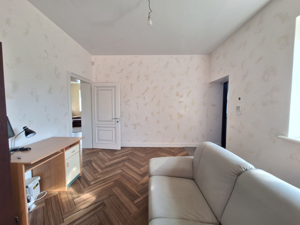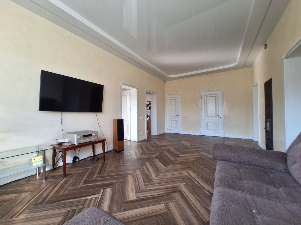 Перший поверх повністю з ремонтом, складається з окремої кухні, просторої вітальні, 2 спалень 16 і 18 м, 2 санвузли,  просторий хол зі сходами на мансардний поверх, вхідна група закритого типу. З будинку є вихід у великий гараж з автоматичними воротами, є 2 погреби, укриття, технічне приміщення.