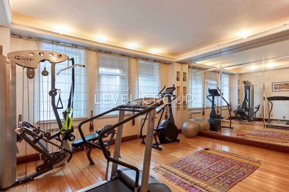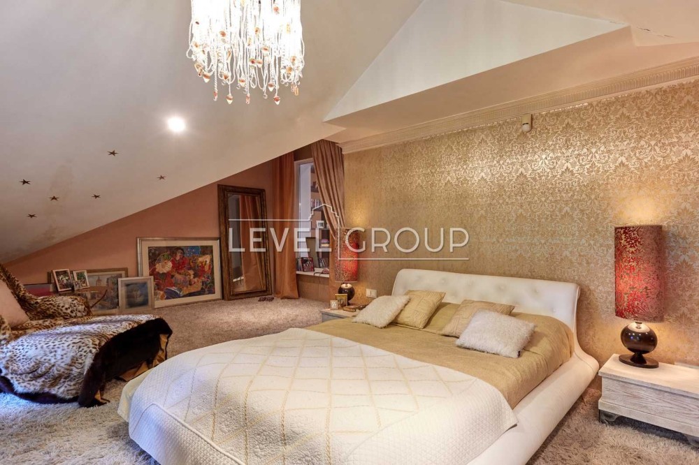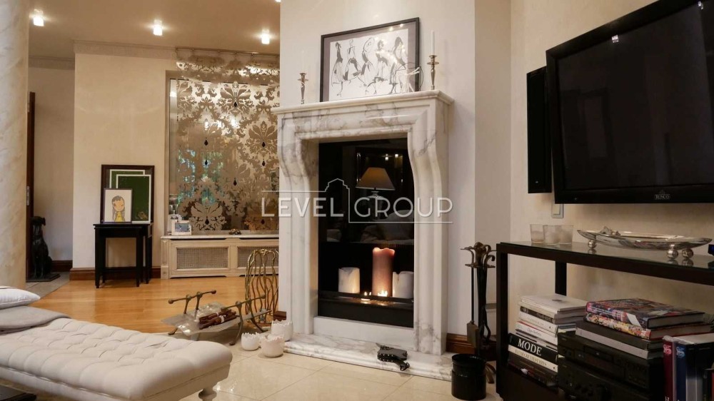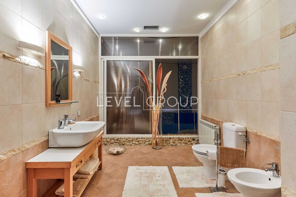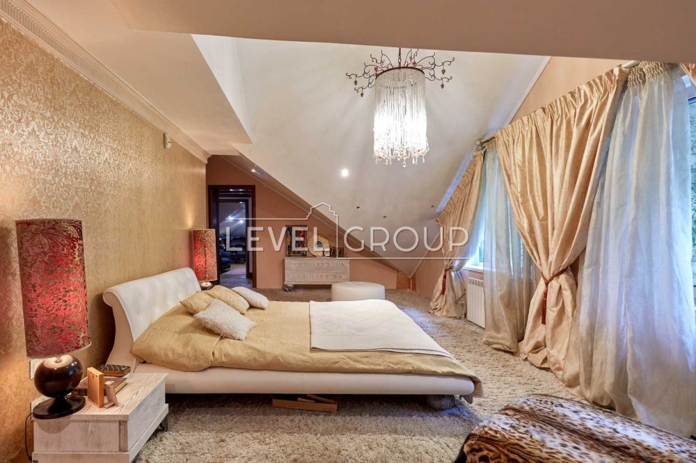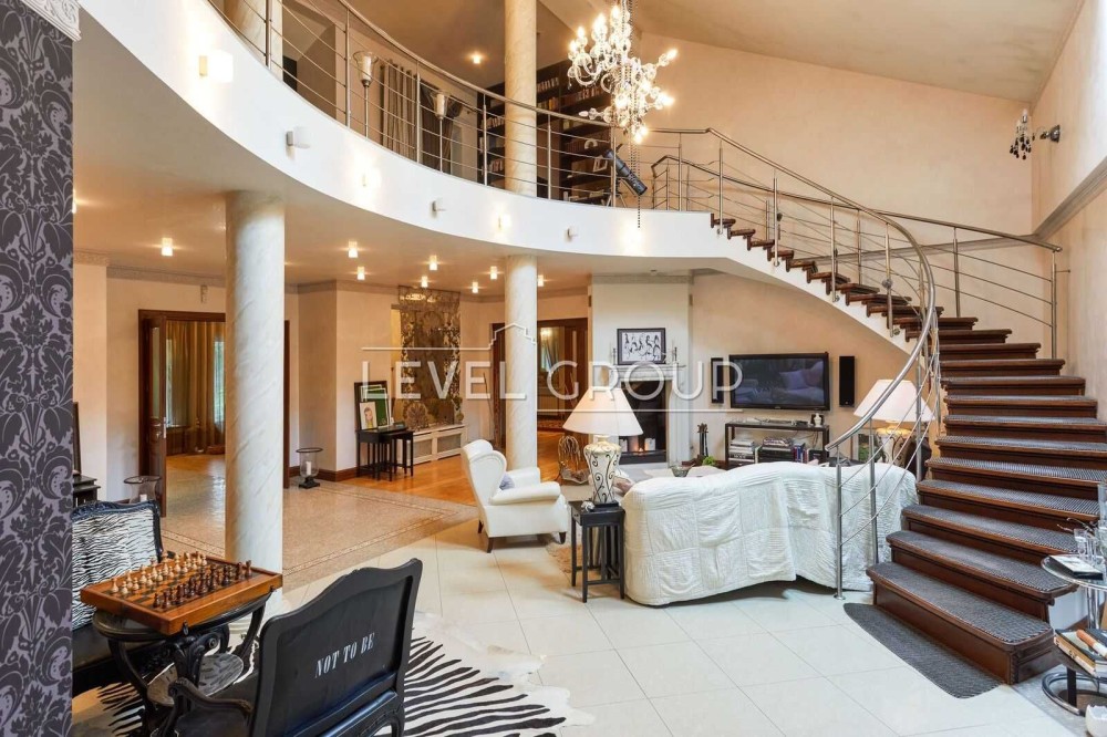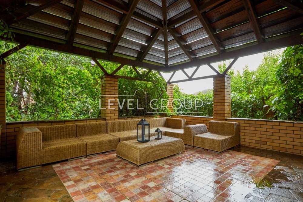 В будинку: вітальня з каміном, кухня з окремим виходом на терасу до фонтану, 4 спальні, 6 санвузлів, кабінет, кімната з кінотетром і акустичною системою Martin Logan, стеля, стіни вікна обладнанані під проф. акустику, кімната з вином на -1 поверсі, сауна з басейном-купелю та спортзалом з обладнанням “Kettler sport”,”Hoist V5”; тераса-зимовий сад на другому поверсі.