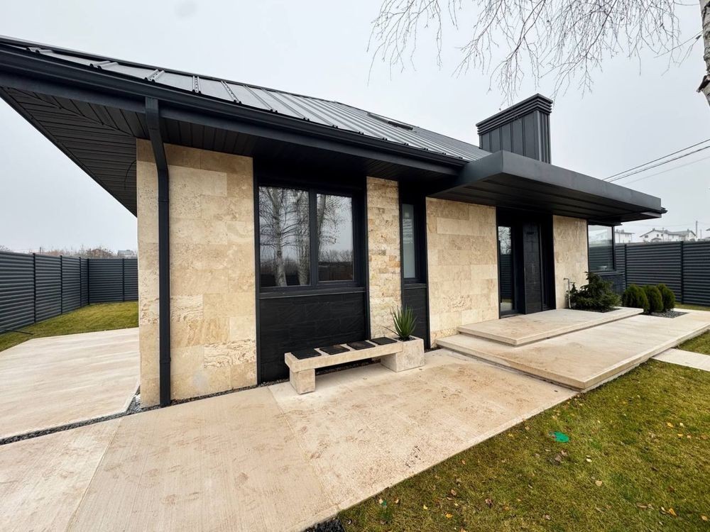 • Фасад — травертин + природний камінь сланець