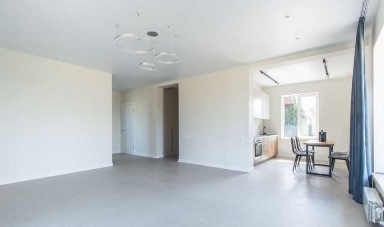 Всередині — відкритий простір під кухню-вітальню: багато світла, велика площа під зону відпочинку та обідню групу, правильне зонування без зайвих перегородок. Інтер’єр у нейтральній сучасній палітрі, яка легко “підхоплює” будь-який стиль меблів — від мінімалізму до сканди чи сучасної класики.