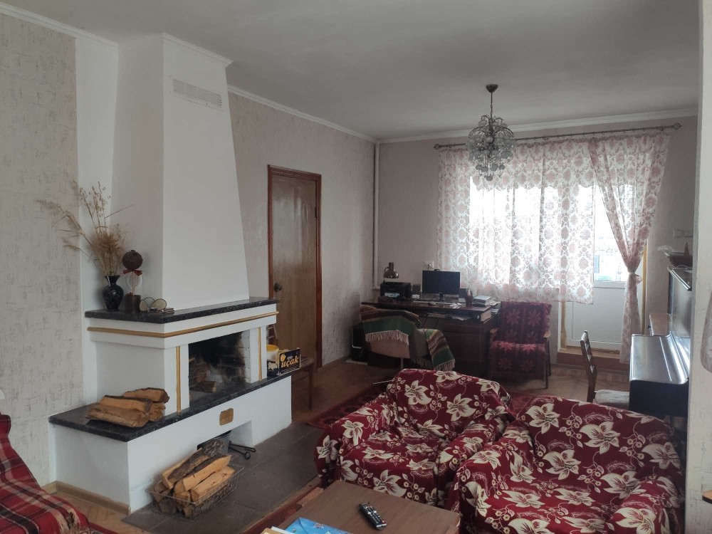 На першому поверсі камінний зал 34м², спальня, кухня і санвузол