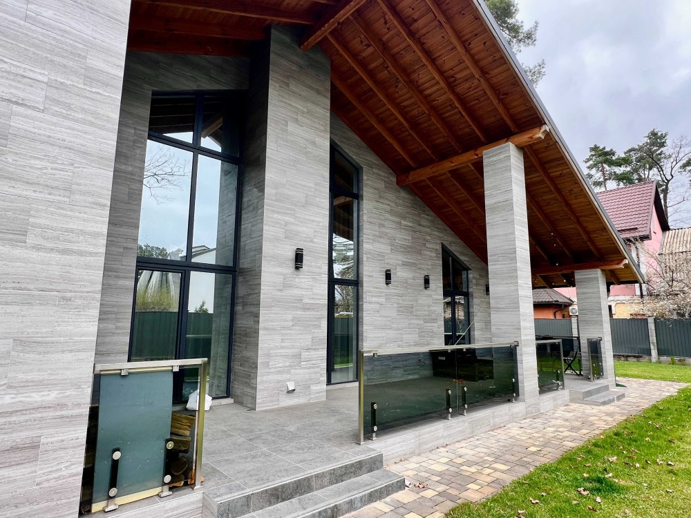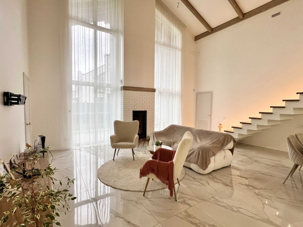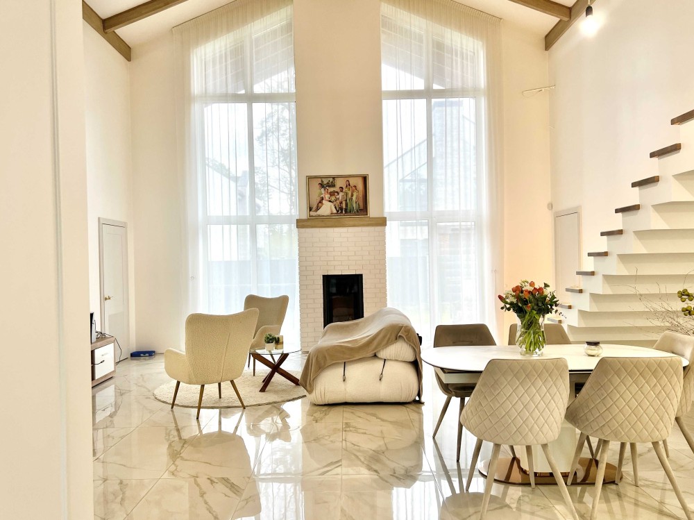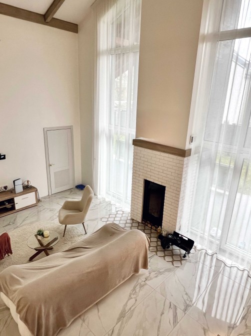 Планування: 4 спальні, кухня, зал з каміном та другим світлом, на другому поверсі можна розташувати кабінет, два гардероба, 3 санвузла, тераса. Сучасний дизайн, стильний інтер'єр, високоякісні матеріали, продумане освітлення.