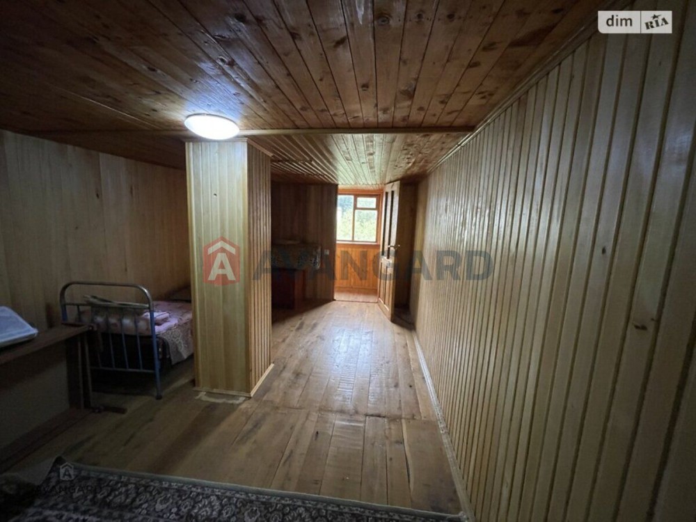 на другому поверсі: простора кімната, обшита деревом;