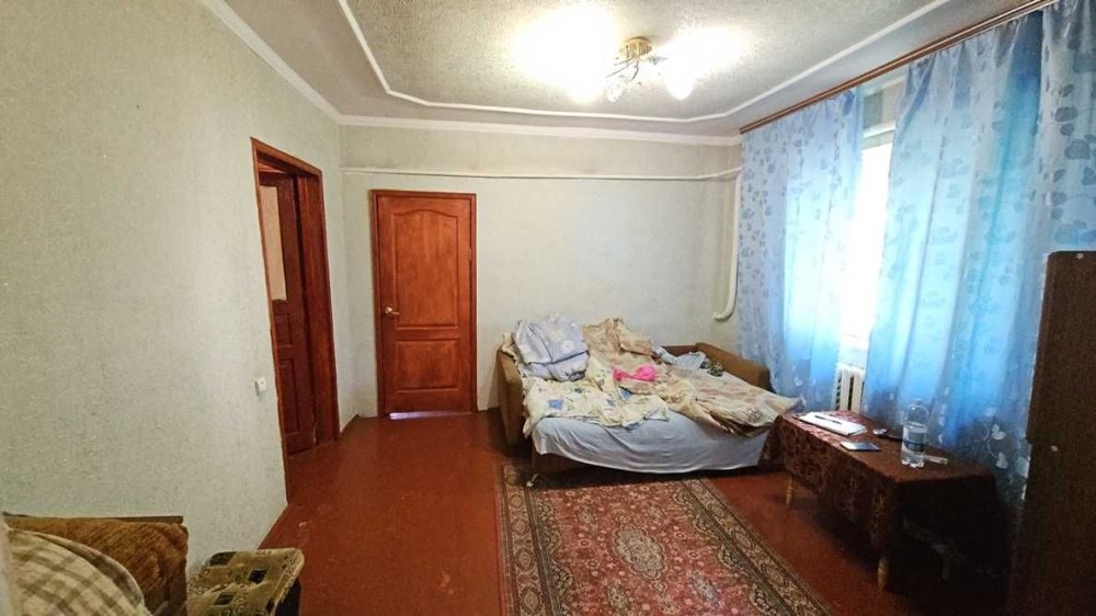 Общая площадь 56кв.м., три комнаты в жилом состоянии, кухня около 11кв.м.