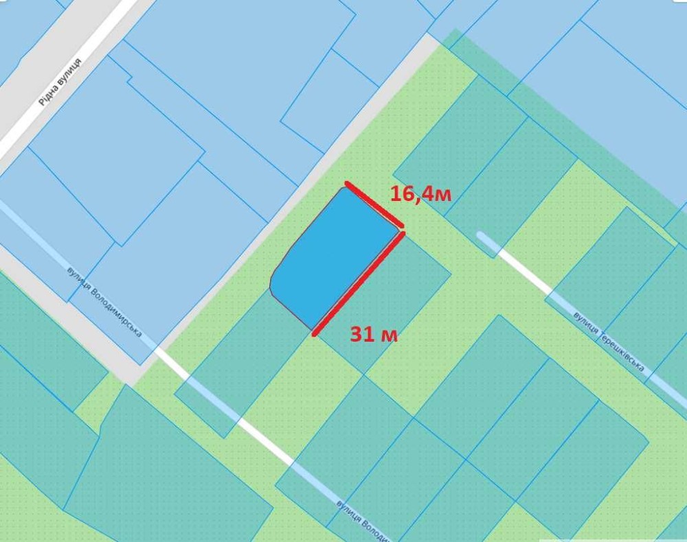 Продаж кутової земельної ділянки з фасадом 16 та 31 метр в глибину (ще один фасад з можливістю другого заїзду).